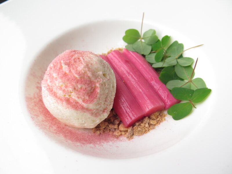 Forårssild, purløgscreme og rabarber. Serveres på grillet rugbrød