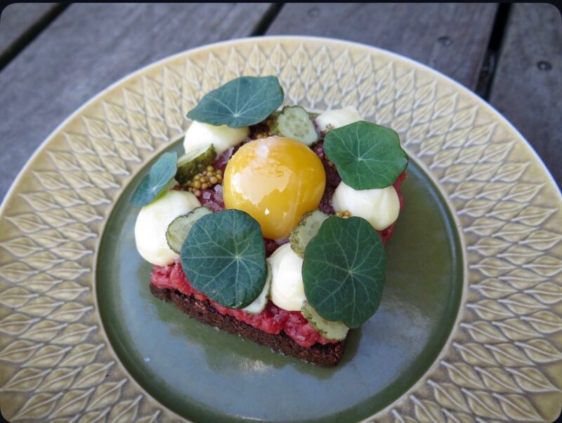 Tatar af økologisk dansk okseinderlår, confiteret æggeblomme og sommersyltet drueagurk. Serveres på grillet rugbrød